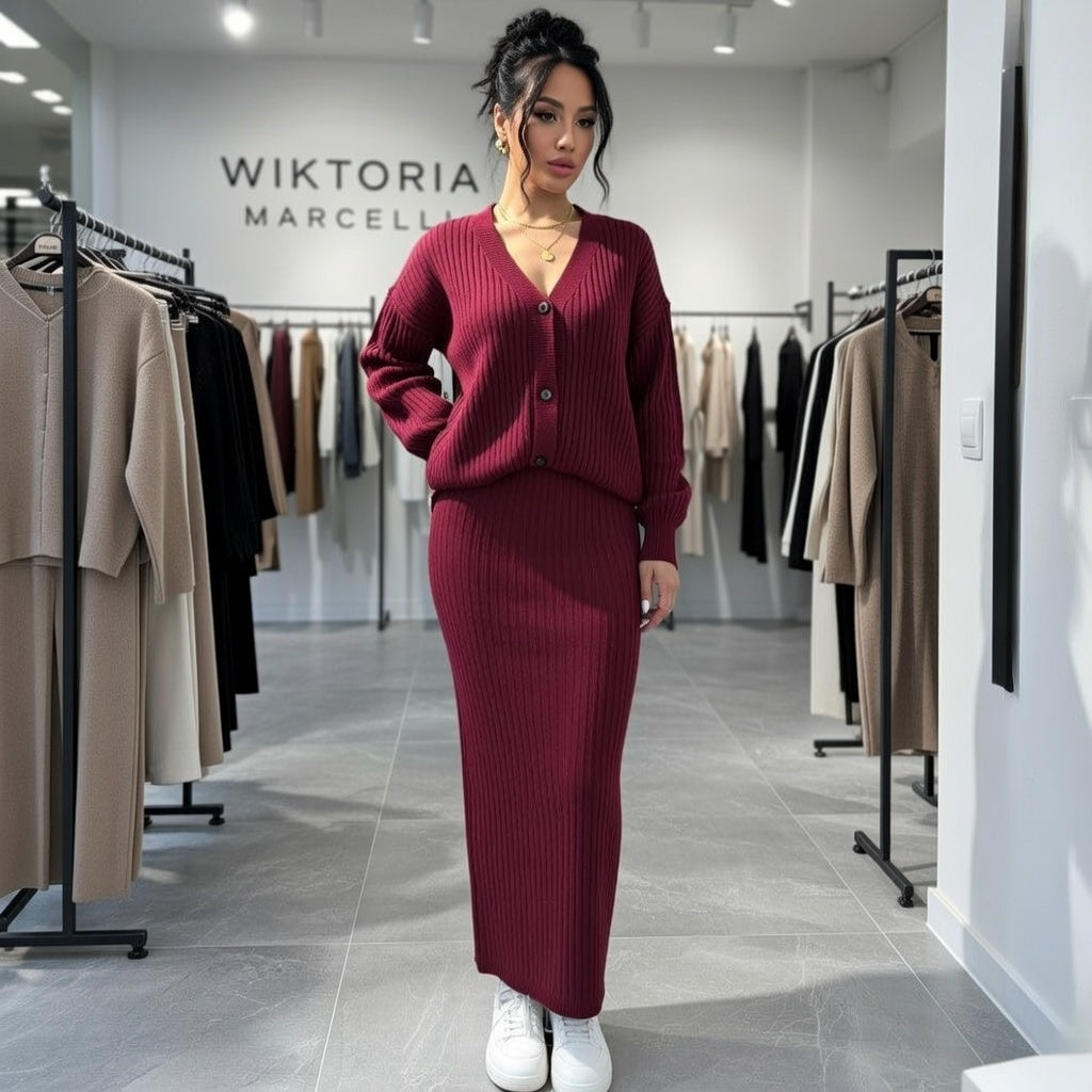W ciągu ostatnich 7 dni wybrano ponad 220 kompletów, czyniąc Marcelli Élégance jednym z najchętniej kupowanych modeli w kolekcji Wiktoria Marcelli. Pionowe prążkowanie optycznie wysmukla figurę, a elegancka długość midi nadaje całości lekkości i klasy.